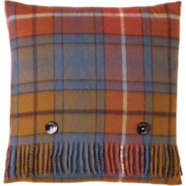 Een duurzaam kussen in originele Schotse Antique Buchanan Tartan ruit. Gemaakt van zachte Merino lamswol. Het kussen heeft prachtige en natuurlijke kleuren en is leverbaar in dezelfde Tartan clans en designs als de plaids. Het kussen is verkrijgbaar in 2 formaten. Het binnenkussen is gevuld met vedervulling en is uitneembaar. De achterzijde van het kussen wordt dichtgemaakt met een met stof bedekte ritssluiting of met franjes en sierlijke knopen.