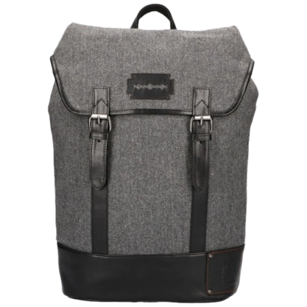 Een functionele, stijlvolle en zeer degelijke Tweed rugzak. Gemaakt van hoogwaardige zwart / grijze tweed en mooi afgewerkt met zwart leder. De rugzak heeft 2 gespen met metalen kliksluitingen, een zijvak met rits en meerdere binnenvakken. Naast de draagriemen eveneens als tas te dragen door de handgreep bovenop. Dat maakt de rugzak extra handig om op reis mee te nemen. Deze rugzak maakt deel uit van de Orange Fire Shelby Brothers collectie.
